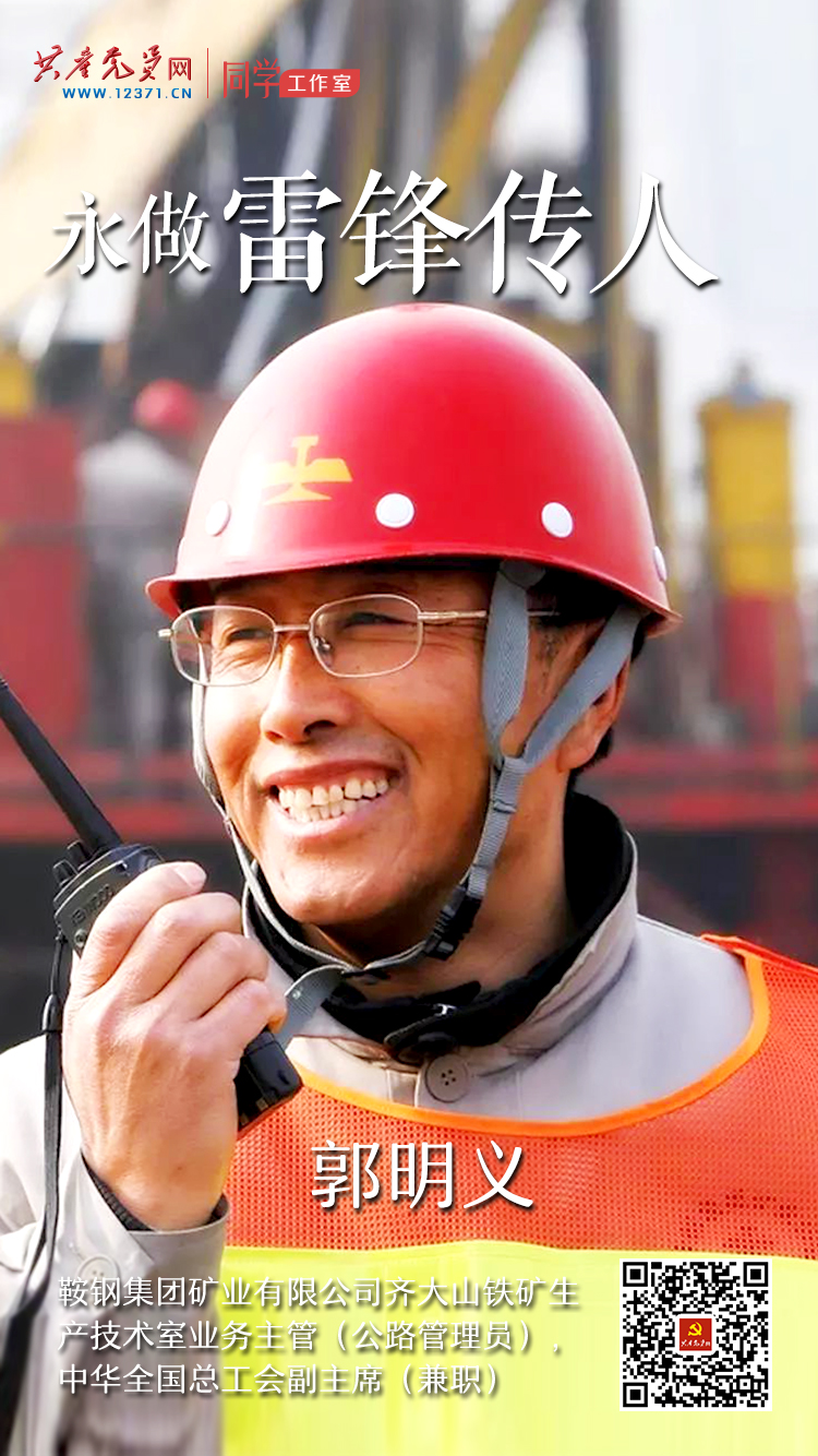 郭明义(1958——),辽宁鞍山人。1980年加入中国共产党。1977年参军,1982年复员到齐大山铁矿工作。鞍钢集团矿业有限公司齐大山铁矿生产技术室业务主管(公路管理员),中华全国总工会副主席(兼职)。他四十多年如一日学雷锋做好事,被誉为“爱心使者”“雷锋传人”。2009年发起成立郭明义爱心团队,全国各地已建立1000余支分队,180多万名志愿者加入其中。荣获“全国优秀共产党员”“全国道德模范”称号和“全国五一劳动奖章”。