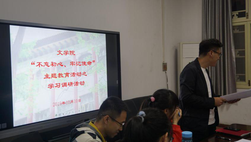 当前,“不忘初心,牢记使命”主题教育活动正在深入开展。为了切实贯彻落实文件会议精神,文艺学与马列文论会联合支部与文艺学研究生党支部,于2019年10月10日晚在文学院三楼会议室联合开展了“不忘初心,牢记使命”的主题教育活动之学习调研活动。活动由文艺学与马列文论会联合党支部宣传委员王海龙与文艺学研究生党支部书记孙铭主持。两个支部的教师党员和学生党员、积极分子齐聚一堂,围绕着初心使命、本职工作及追梦圆梦等方面展开了讨论与交流。