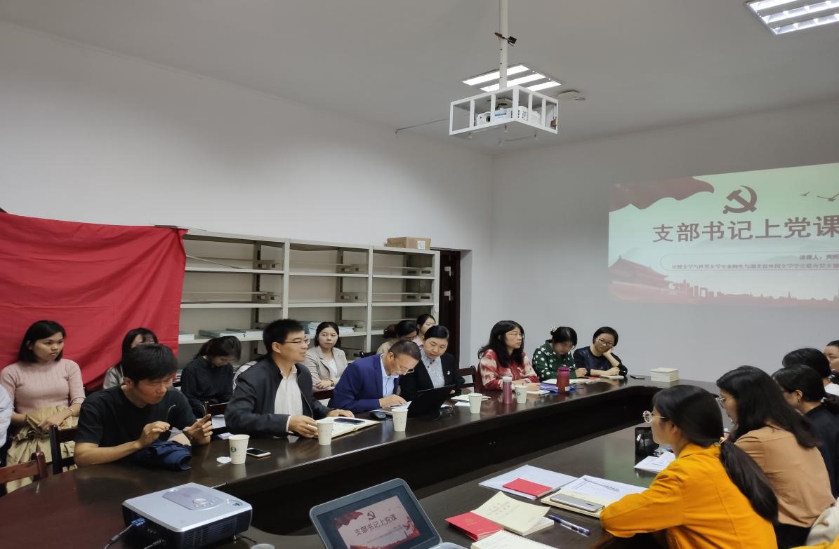 (通讯员:朱家琪)2019年10月10日下午1点,比较文学与世界文学专业师生与湖北省外国文学学会联合党支部“我和我的祖国”主题党日活动于比较文学与世界文学教研室顺利召开。支部全体教师党员、学生党员(含预备)、入党积极分子及入党申请人参加了本次活动,院党委徐福刚副书记也亲临活动现场与大家共同学习交流。活动由支部书记黄晖同志主持。