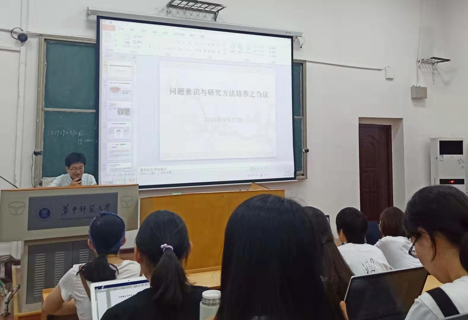 (通讯员:刘晨茜)2019年9月27日下午4点,应文学院文史直博班“励心”学术沙龙的邀请,武汉大学文学院副教授、硕士研究生导师严靖,以“问题意识与研究方法之培养刍议”为题,在文学院2201教室为师生们作了一场精彩的讲座。沙龙由2018级文史直博班班导师王海龙主持,18级文史直博班学生和其他文学院学生参加了此次活动。
