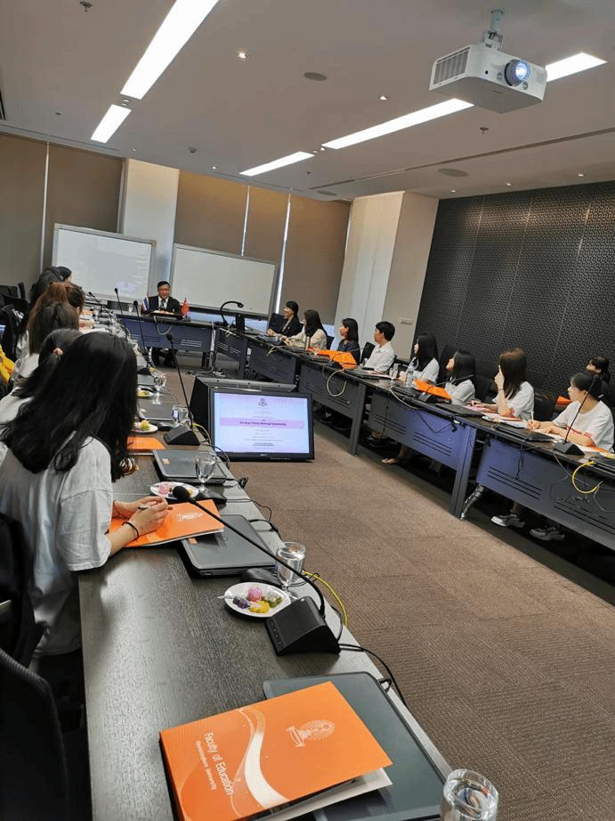 随后,调研团观看了朱拉隆功大学及其教育学院的介绍片。朱拉隆功大学始建于1917年,是泰国的第一所高等学府,它以卓越的学术成就而闻名于世。在这里,近一个世纪的光荣传统与现代研究领域完美地结合在一起,在2016年QS亚洲大学排名中,该校排名泰国第一。朱拉隆功大学教育学院成立于1957年,是朱拉隆功大学的第七系。目前,教育学院在教育和教师教育方面被广泛认为是泰国的“学术参考和学习资源”,以教育的演进、先进的学术原则、国际教育的推进来响应国家的需要。