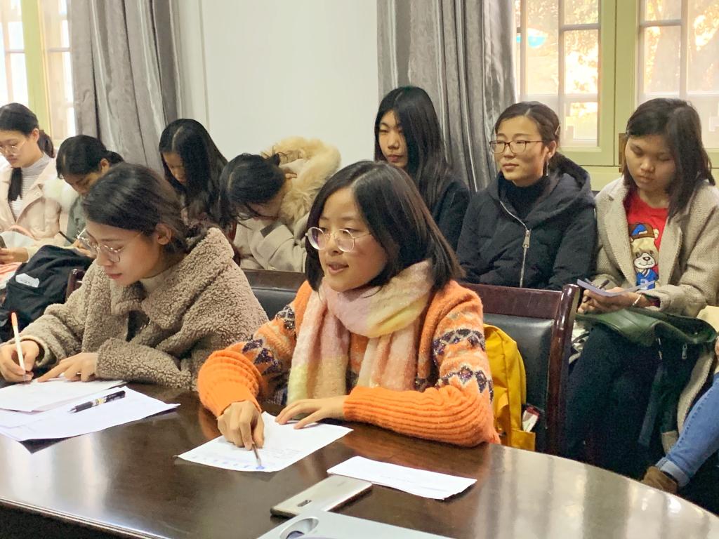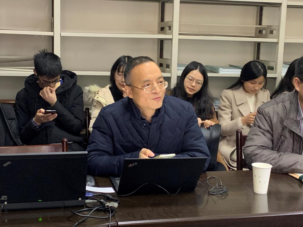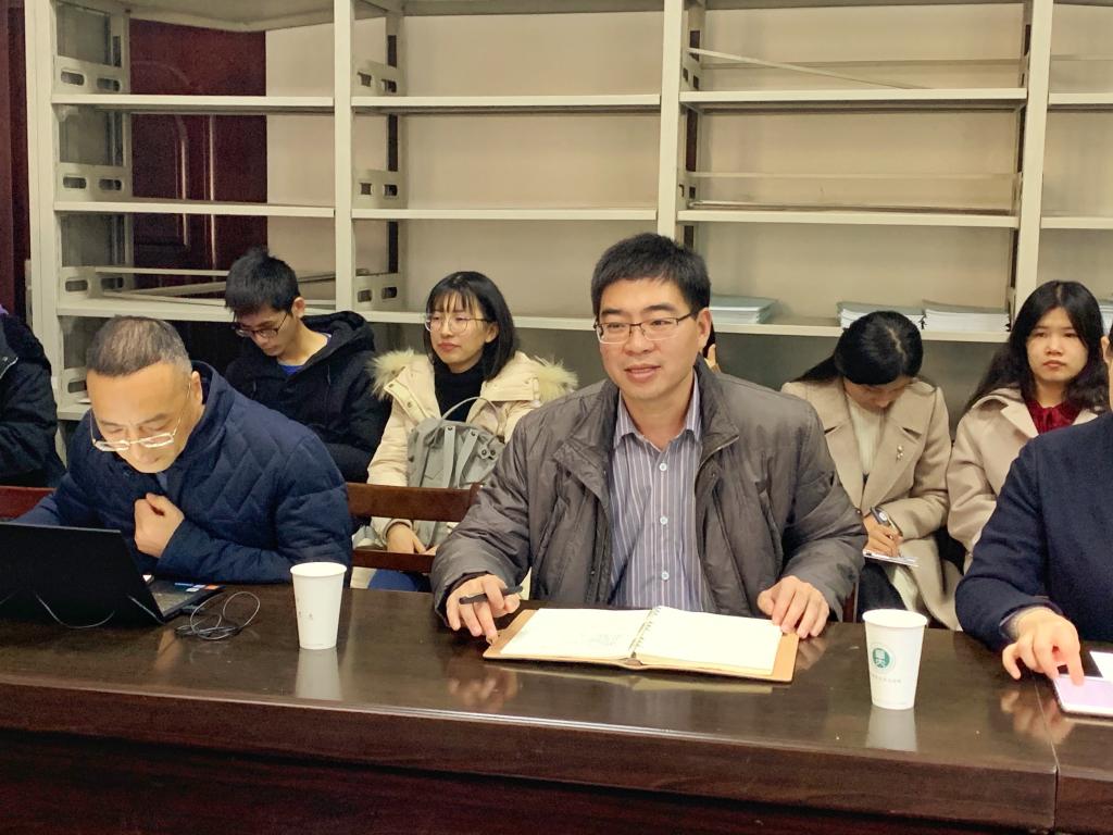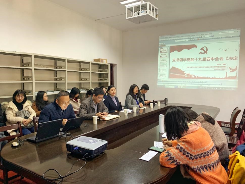 其次,黄晖支部书记领学党的十九届四中全会《决定》,就其中重要精神带领大家集体学习,重点学习了以下几个方面:坚持和完善党的领导制度体系,提高党科学执政、民主执政、依法执政水平;坚持和完善繁荣发展社会主义先进文化的制度,巩固全体人民团结奋斗的共同思想基础;坚持和完善中国特色社会主义行政体制,构建职责明确、依法行政的政府治理体系;坚持和完善“一国两制”制度体系,推进祖国和平统一;坚持和完善生态文明制度体系,促进人与自然和谐共生。书记结合学科发展状态,提出生态发展领域由人类中心主义向人类共同体转变,并将“人类命运共同体”一词与本学科特色结合,给同学们提供了学术方面的有益见解,从而进一步强调了外国文学研究要与时俱进。
