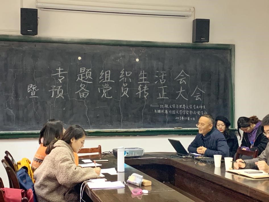 (通讯员:朱家琪)根据党中央和省委关于“不忘初心、牢记使命”主题教育活动专题工作部署,12月11日中午,比较文学与世界文学专业师生与湖北省外国文学学会联合党支部在教研室召开了专题组织生活会暨预备党员转正大会。支部书记黄晖同志担任主持人,文学院分党委徐福刚副书记、教师党员、学生党员及入党积极分子参加了此次活动。
